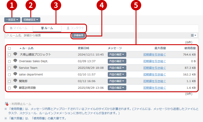 ルームではルーム名、詳細、使用容量の範囲を指定して検索できます。
