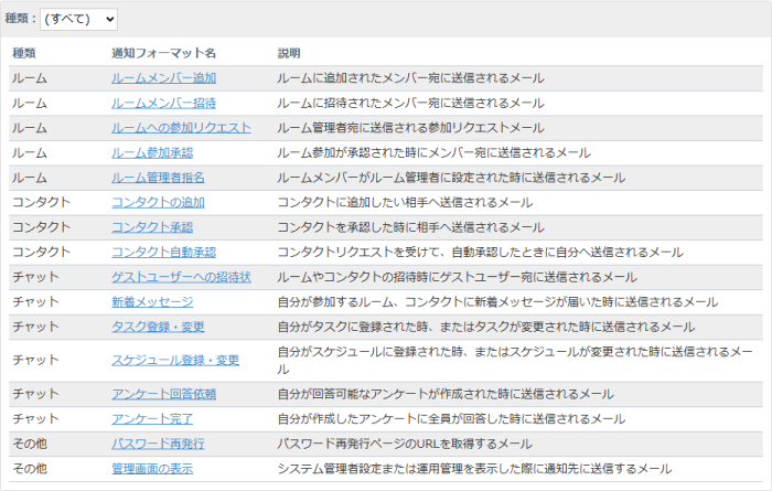 メール通知設定 > 通知メールフォーマット管理の項目を押すと、通知メールフォーマット管理画面が表示されます。