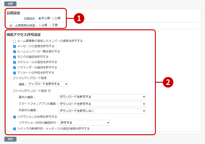 ※ルーム作成権限設定で「選択したユーザーのみ作成できる」が選択されている場合のみボタンが表示されます。