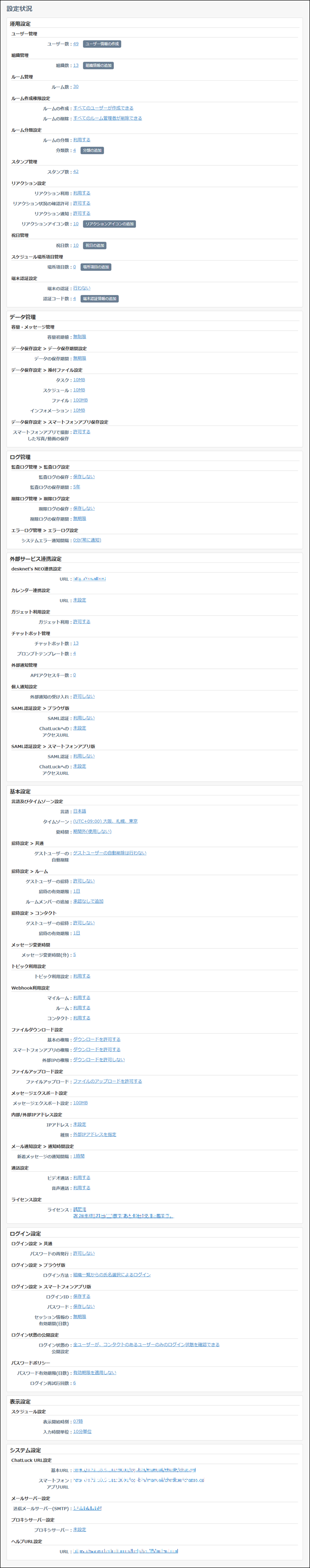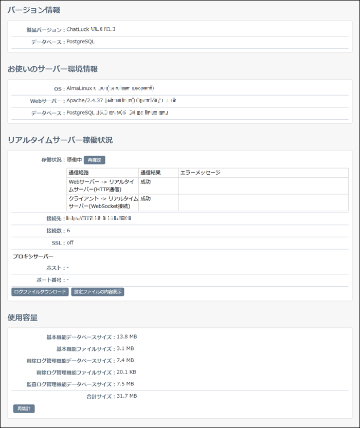 ChatLuckのシステム情報では各種設定状況とバージョン情報を確認できます。