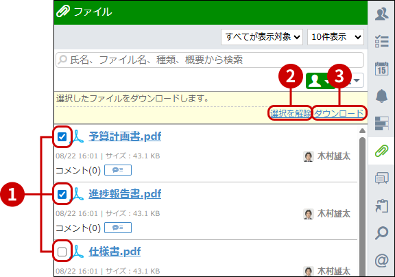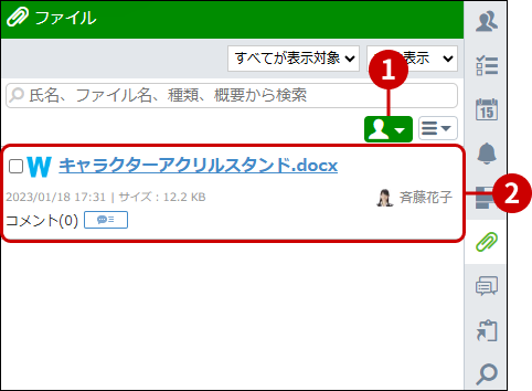 特定のユーザーがアップロード・更新したファイルを確認できます。一覧上部のユーザーボタンを押し、絞り込み検索をご利用ください。