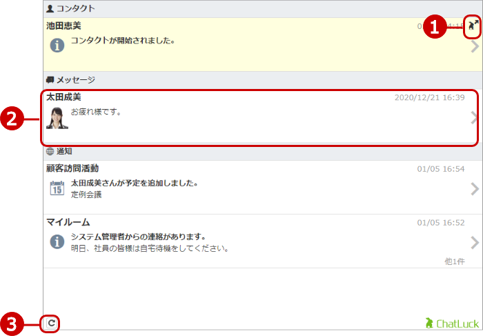 新着通知一覧ガジェットでは、メッセージ・システム通知の確認や、メッセージへの返信を行うことができます。