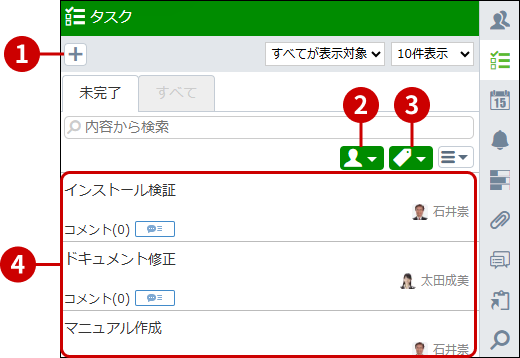 特定のユーザーが登録先となっているタスクを確認できます。一覧上部のユーザーボタンを押し、絞り込み検索をご利用ください。