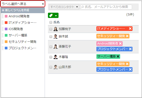 メニュー上部の「ラベルを付ける」を押すとコンタクトにラベルを追加したり、ラベルの管理が利用できる画面に切り替わります。